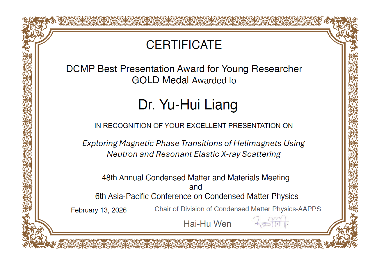淡江物理系友粱喻惠,因在凝聚態物理領域展現卓越之研究能力與創新見解,榮膺第 48 屆凝聚態物理與材料年度會議(Wagga 2026)暨第 6 屆亞太凝聚態物理會議(APCCMP-6)之【DCMP 青年學者優秀發表獎 (Best Presentation Award for Young Researcher)】。本獎項旨在表彰在亞太地區凝聚態物理領域具有卓越研究貢獻與發表能力的青年科學家。該獎項由亞太物理學會聯會(AAPPS-DCMP)主席聞海虎教授親自簽署頒發。