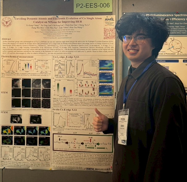 其中,李奇峰同學以奈米顆粒材料在不同反應條件下的結構演變為研究核心,在新興能源科學組中獲得壁報佳作。他坦言,能在競爭激烈的評選中獲獎,對自己而言是一種重要的鼓勵,也代表研究想法與表達方式獲得專業社群的認可。張億宏同學則聚焦於單原子催化系統,深入探討其在不同反應條件下的結構與性能關聯,成為唯一一位來自私立大學獲得壁報優等獎。他分享,這項研究在初期其實面臨不少挑戰,包含數據一致性與物理詮釋的反覆修正,但正是在一次次討論與修正中,研究脈絡才逐漸清晰。
