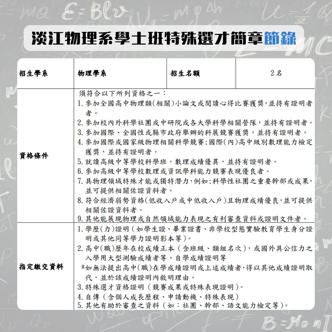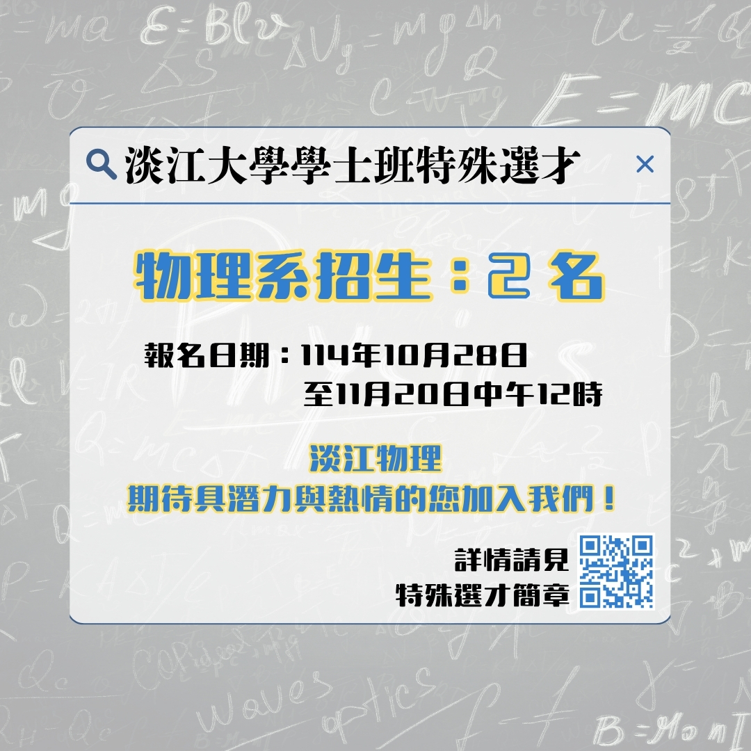 【系所公告】淡江物理系學士班特殊選才招生114.10.28開始-114.11.20中午截止