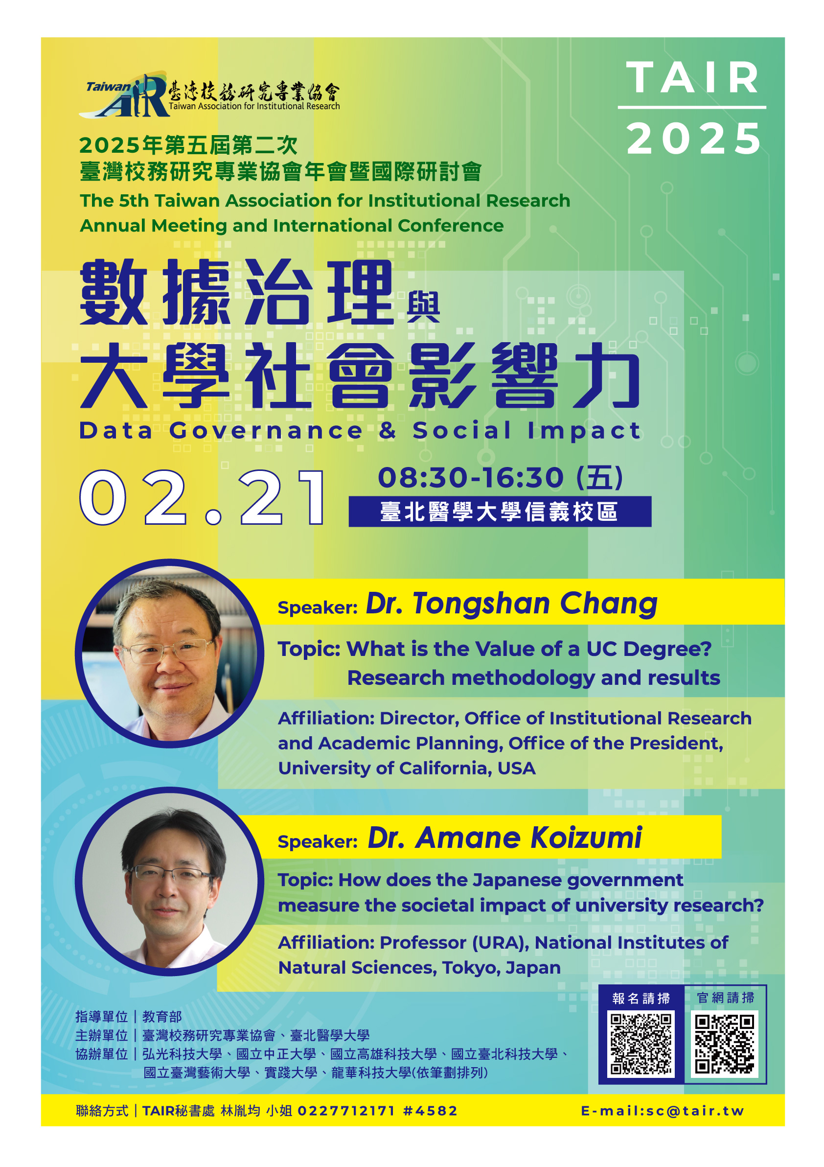 四、研討會另安排七場論壇以及海報展,除分享各校校務研究的精采案例與應用外,並安排專場介紹新興的數據分析技術。敬請轉知所屬同仁於2025年2月7日(星期五)前至研討會官網報名(研討會官網:https://sites.google.com/tair.tw/tair2025)。