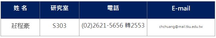 依「淡江大學跨領域專長課程實施要點」第7點「由各學系設置跨領域專長課程輔導教師,輔導修讀本系跨領域專長課程學生之選課規劃及課程學習歷程」,本系跨領域課程輔導教師聯絡資訊如下: