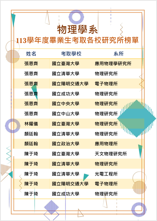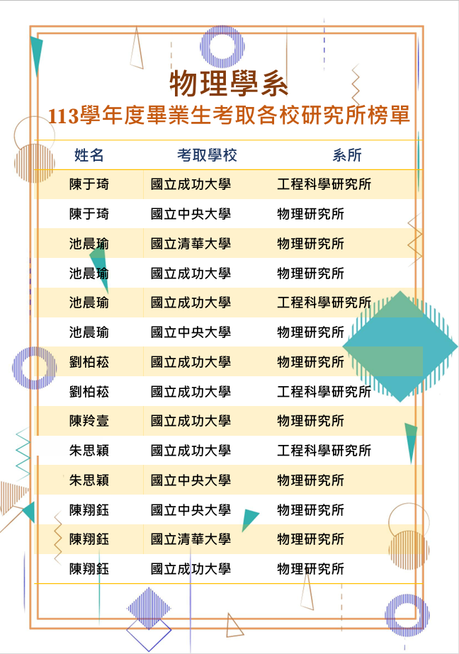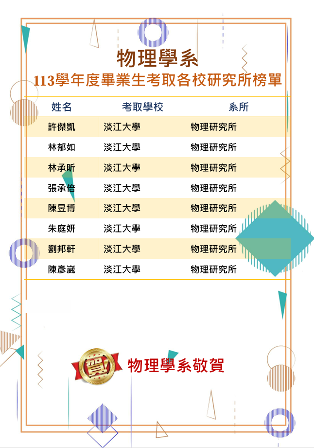 淡江物理畢業生考取研究所榜單