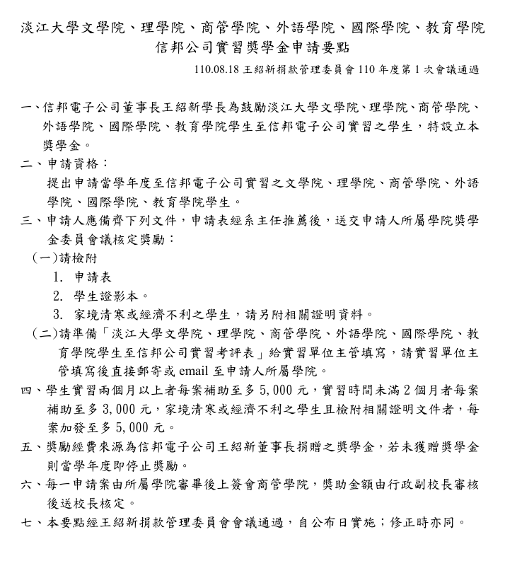 【系所公告】淡江大學信邦公司實習獎學金申請要點