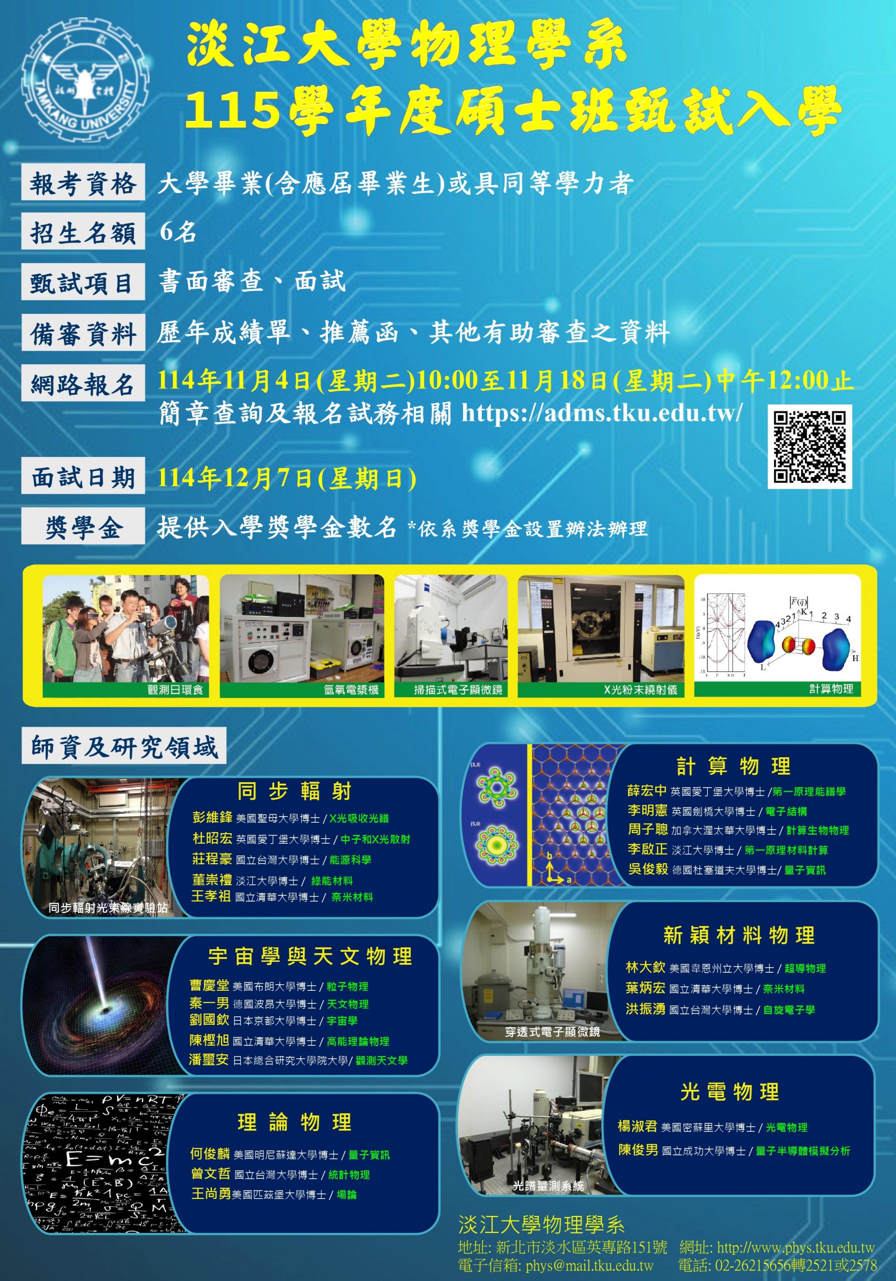 【系所公告】物理系115學年度碩士班甄試入學開始報名,歡迎同學踴躍報名