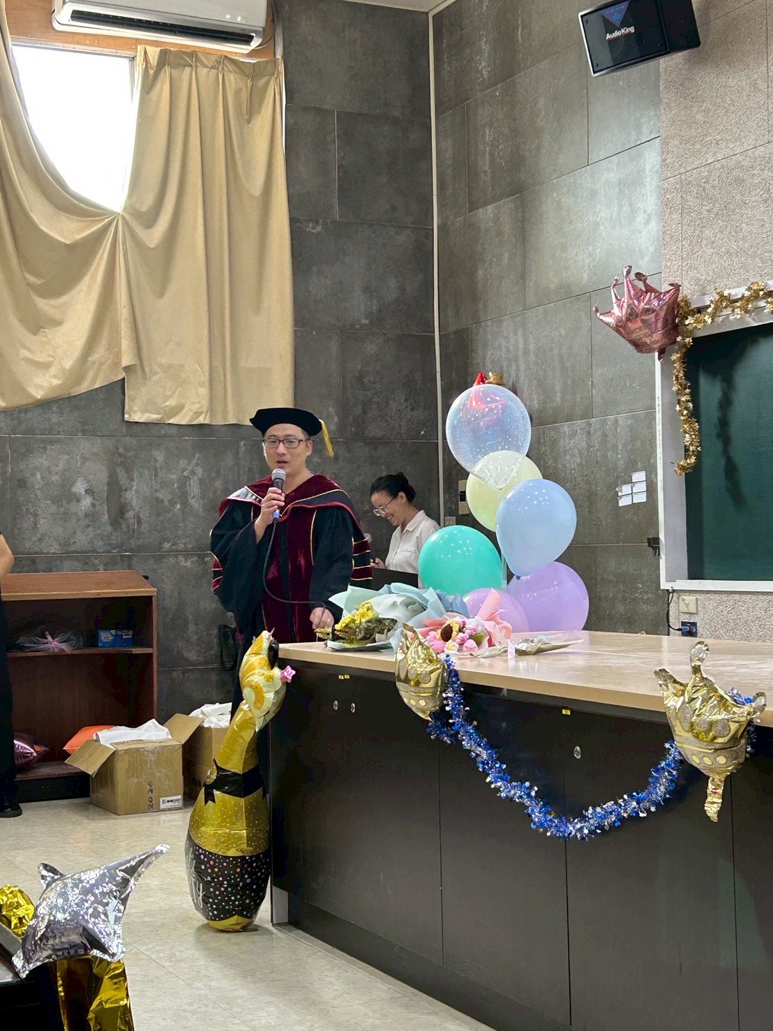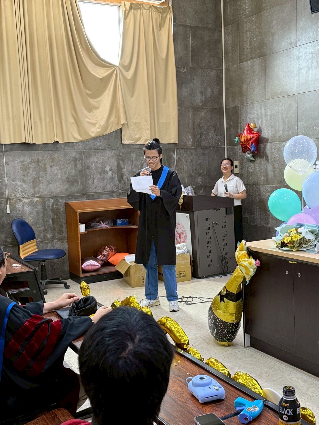 請問,同學畢業後規劃是否已經清楚了嗎?我舉了20多年前個人經驗跟大家分享,當年從高師大物理系畢業時,心裡面還無法接受去高中端當老師,所以決定繼續念物理碩士班,結果發現自己喜歡做科學解釋原理,因此繞了一大圈還是成為一位大學老師,所以鼓勵同學當下若無法決定方向,不妨選擇你最不討厭的方向走下去。大學裡面有著形形色色不同同學和老師,我相信我們物理系老師在這四年裡面,除了物理專業知識外,也默默展現最好例子,希望同學持續往良善道路前進,成為最好的自己和範例。同學如同一顆蛋,爸媽將你們放在淡江這個窩,我們盡力給予你最好資源讓你破殼長大,有些同學將來變成是鳥 鱷魚 或是老鷹,但最重要的是,自己要想辦法打破外面那個束縛殼。最後,我知道主任我沒上過大家的課,很多同學不記得我的名字,我叫莊程豪,是淡江物理系主任!祝大家畢業快樂!